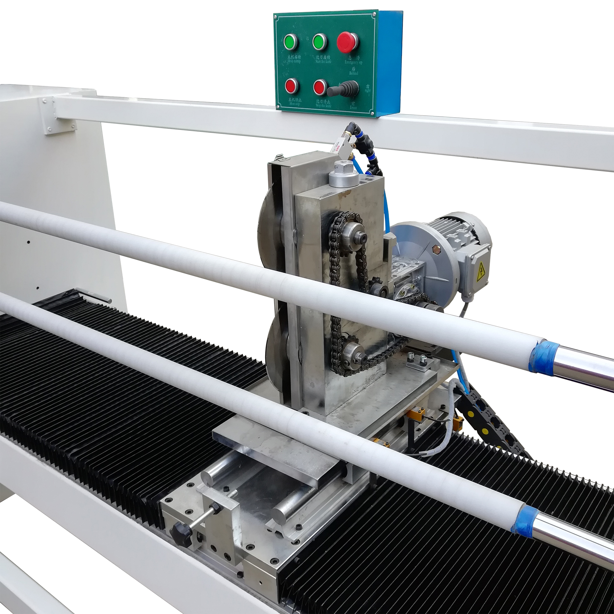 3. 切卷定位系統使用步進(jìn)電機控制,高精度滾珠螺桿進(jìn)行尺寸定位及使用線(xiàn)性滑軌承載刀座,定位動(dòng)作精準平順